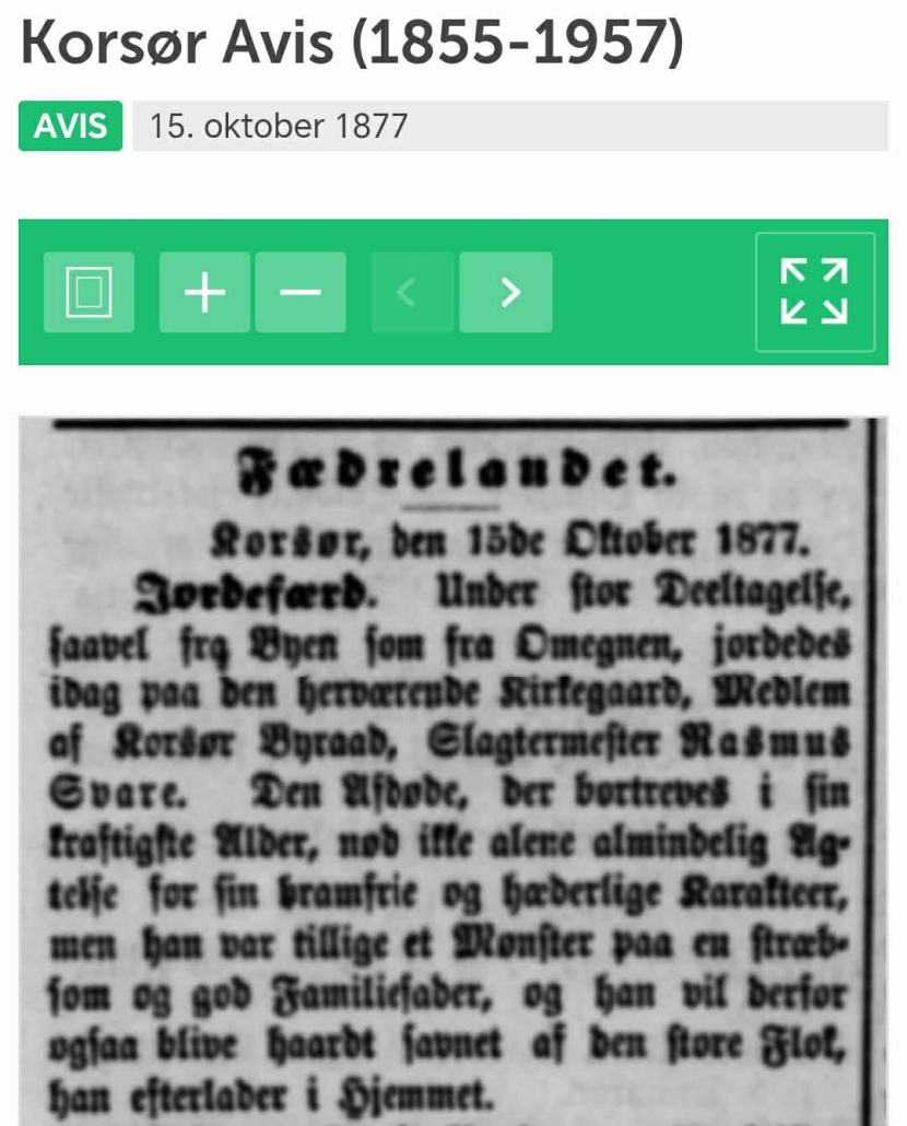 Slagtermester Poul Rasmus Død 8. okt. 1877 Korsør Avis 15 okt 1877.