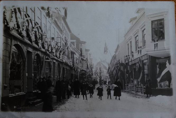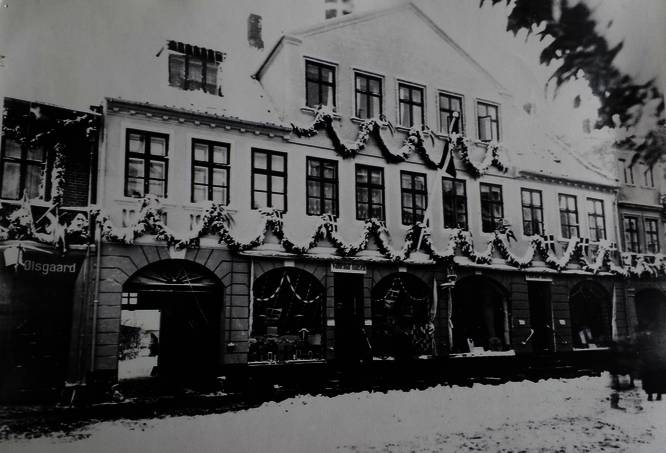 Algade 50 med Valdemar Hansens forretning, der er pyntet med danske varer i forretningsvinduerne og Korsør byvåben. Granguirlander i anledning af 500 års byjubilæet, november 1925. Ølsgaards forretning til venstre. Kilde til billedet er Lokalarkivet i Korsør